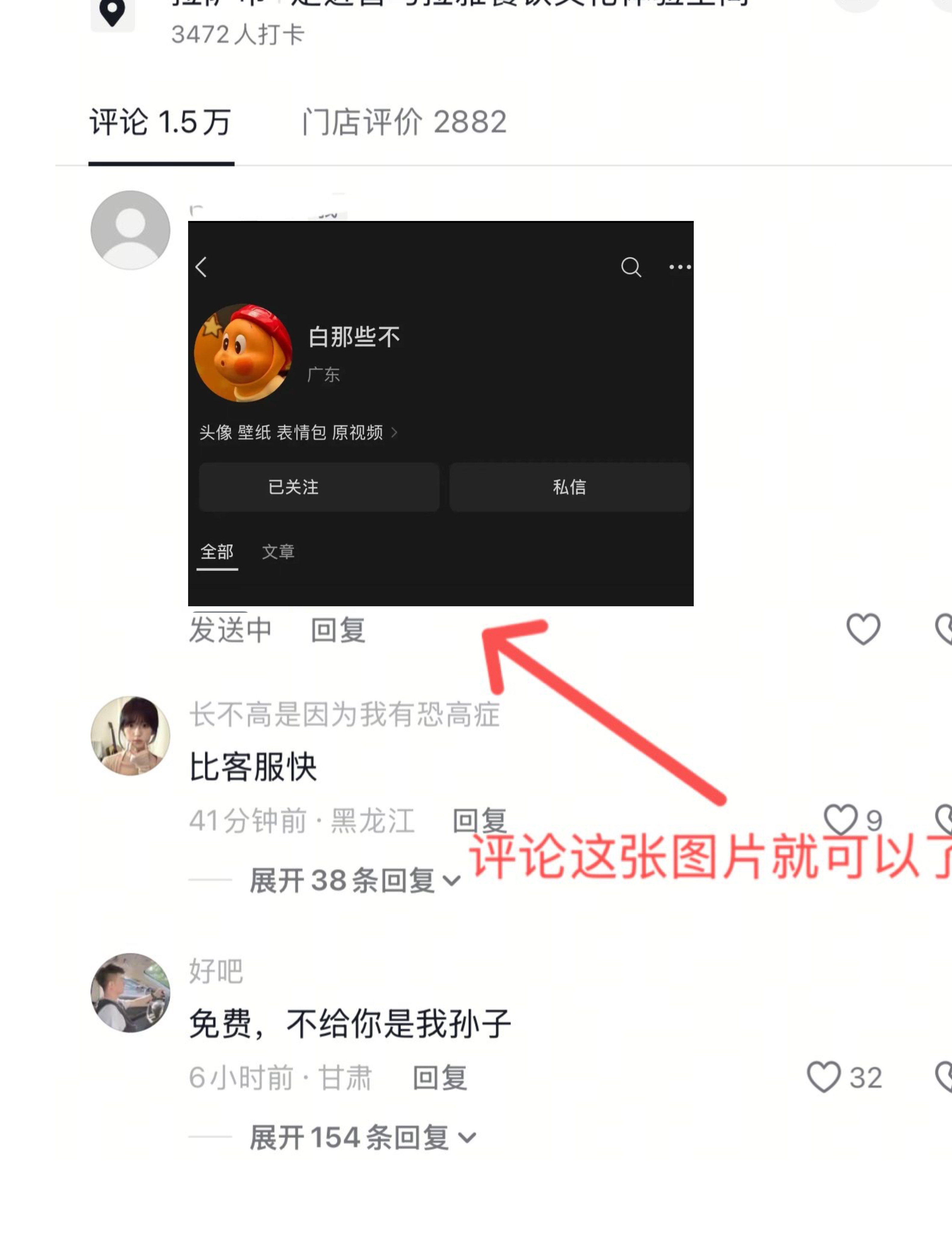 打开抖音搜索关键词,搜索后往下滑,选3个评论少或者没有评论的作品 评论上面刚保存的图片,每个作品评论一张 最后给自己点个赞,并截图